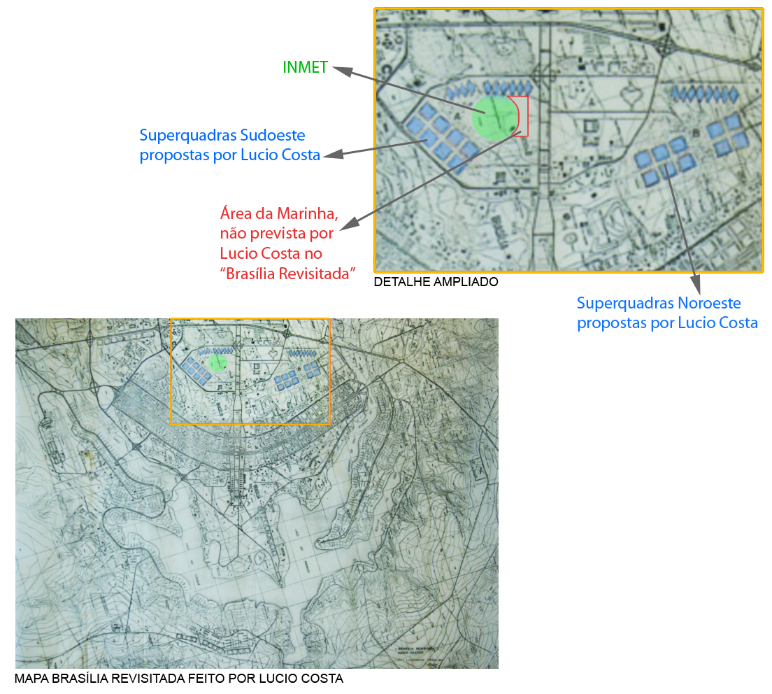 O “Brasília Revisitada” traz um mapa onde Lucio Costa definiu como seriam os Setores Sudoeste e Noroeste, à época denominados Áreas A e B, respectivamente. Nesse mapa facilmente se verifica que não havia previsão para essa área que a Terracap criou para a Marinha, ou seja, essa área nunca poderia ser considerada uma expansão do Setor Sudoeste, tampouco ser ocupada por uma nova Superquadra. Criar essa nova área residencial no Setor Sudoeste é uma extrapolação do que a legislação permite.