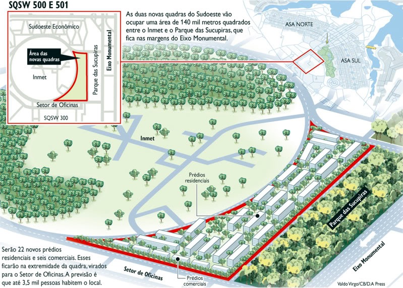 Infográfico Correio Braziliense ilustra localização e conformação da Quadra 500, entre o INMET e o Parque das Sucupiras/Eixo Monumental.